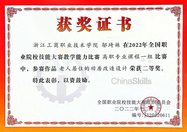 环境艺术设计教师在2022年全国职业院校技能大赛教学能力比赛中荣获二等奖。
