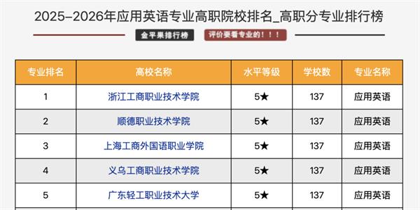 在如此激烈的竞争与严格的评价标准下,浙江工商职业技术学院应用英语专业凭借雄厚的师资力量、优质的教学平台、卓越的教学水平、丰硕的科研成果及广泛的社会声誉,脱颖而出,连续三年蝉联 “金平果排行榜” 榜首!这一成绩不仅是对我校应用英语专业长期以来高质量建设与发展的高度肯定,更是全体师生共同努力、砥砺奋进的辉煌成果。