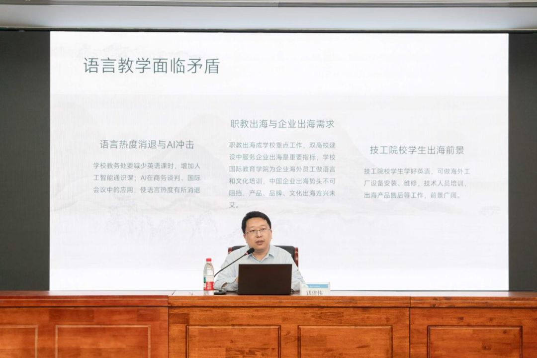 钱律伟副教授凭借其 17 年英语口语比赛的丰富经验,以及在省赛、国赛中多次参赛经历和执裁经历,深入浅出地阐述了“中国故事的定义”“高职院校讲中国故事的实践路径”以及“技工院校如何有效开展中国故事教学”等关键问题。他结合生动的案例和前沿的教育理念,为在场的教师们提供了极具启发性的思路与方法。