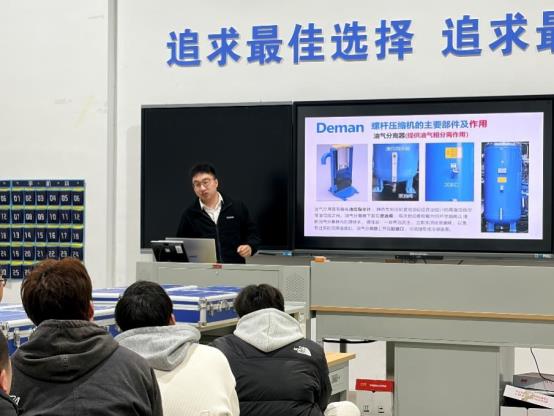开班仪式后,企业工程师为学员开展首堂专业课程,围绕空压机运行原理及自动化控制系统进行理论讲解,并结合设备实物开展现场教学,将抽象原理与真实工业设备结构相结合,使学生直观理解自动化装备运行逻辑。通过“理论讲授+实物解析”的教学方式,进一步强化学生对专业知识在实际生产中的应用认知,提升工程实践理解能力。